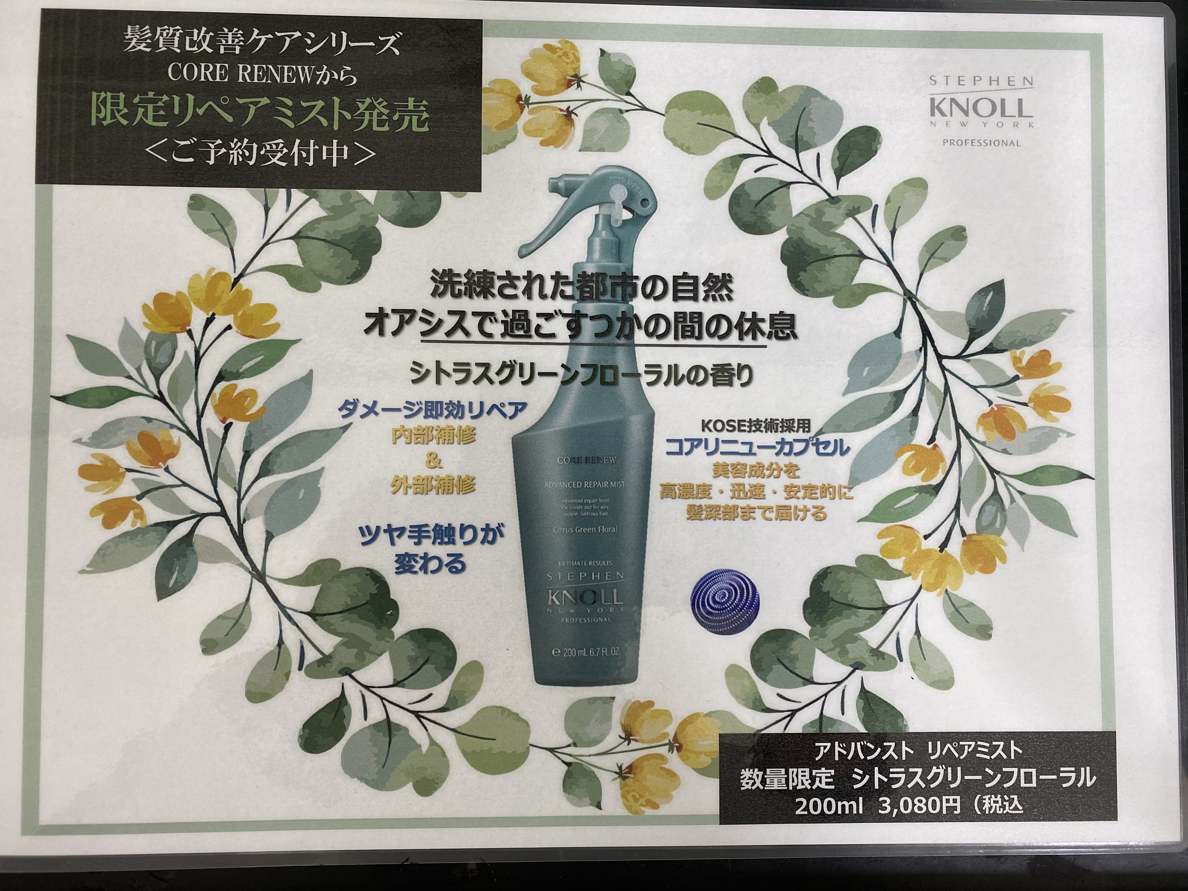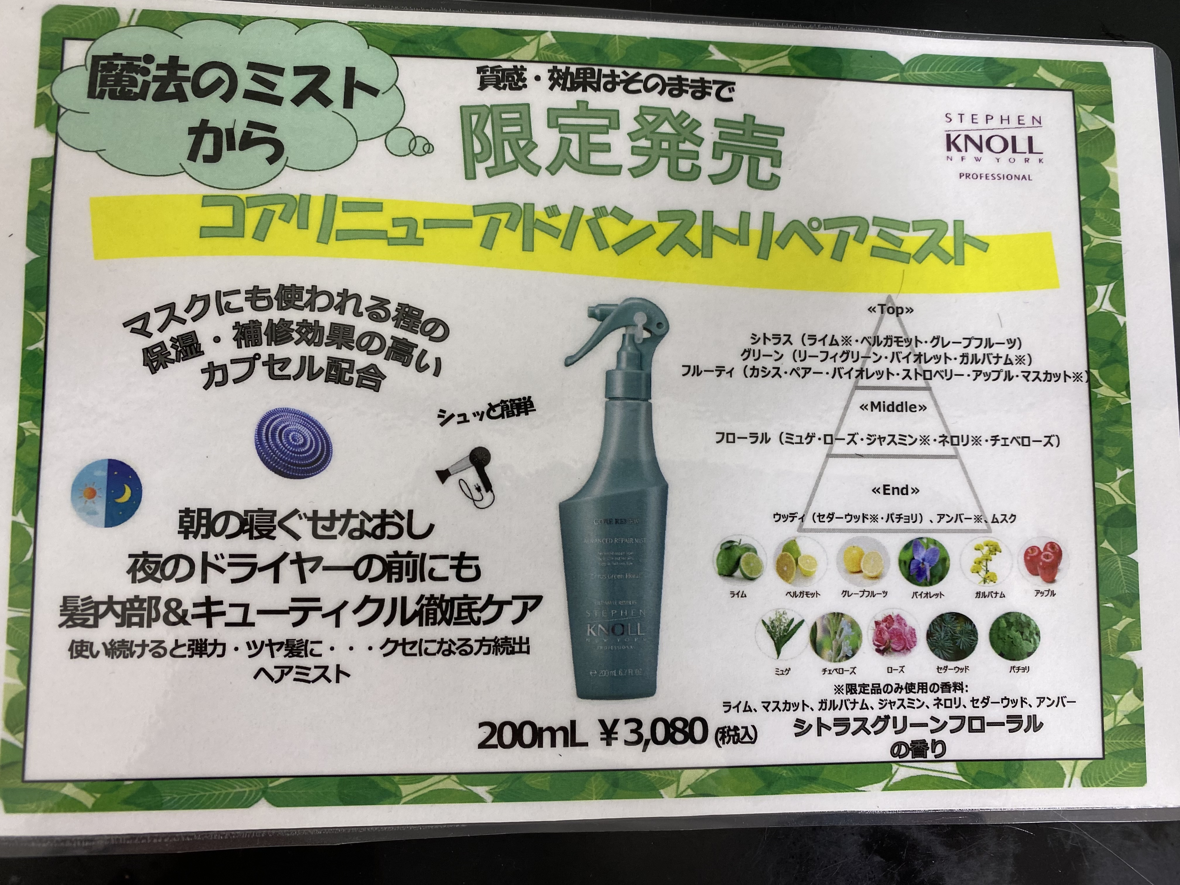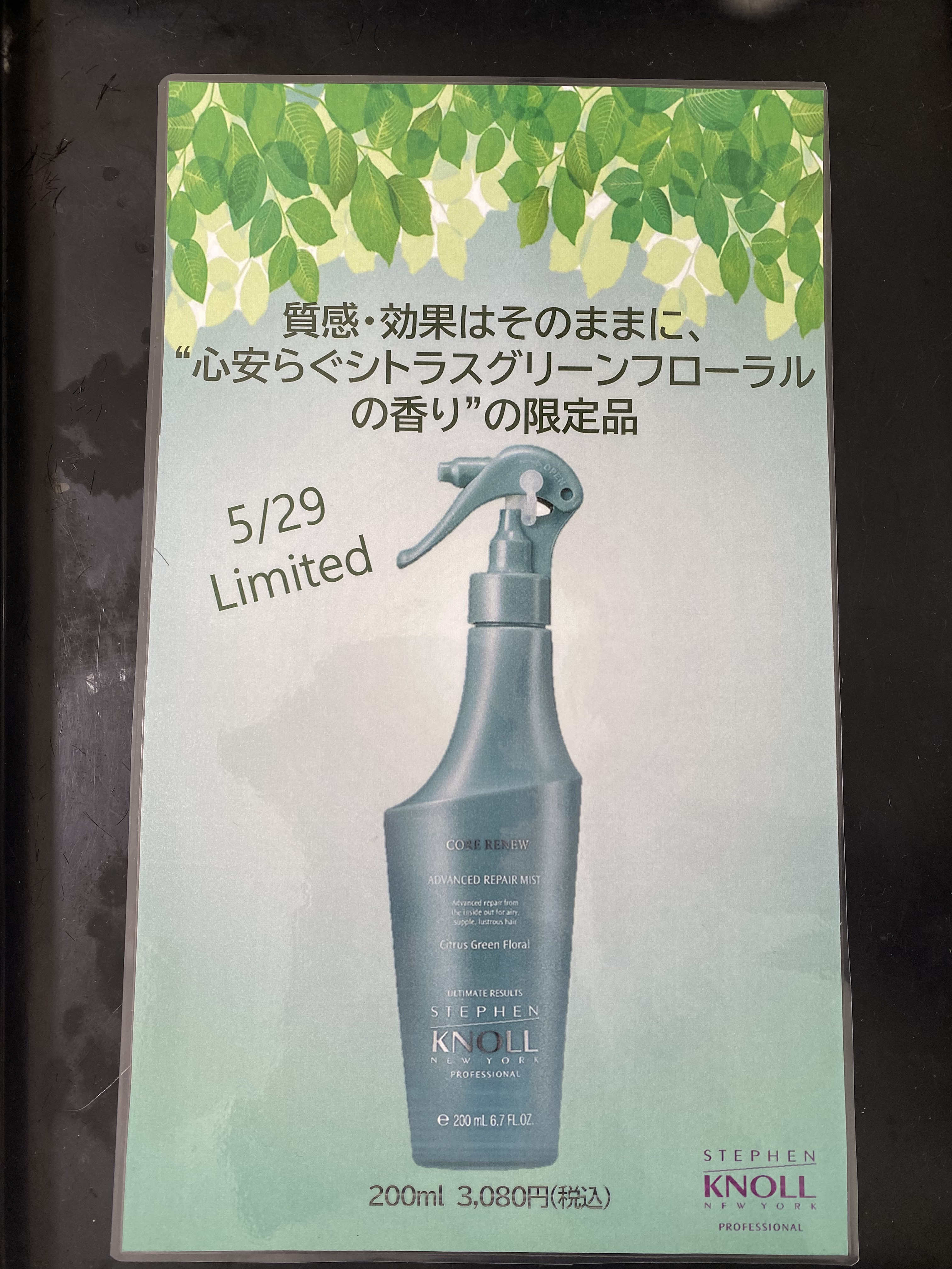 二つ目は 営業でも使用しています リペアミスト(ブローローション)シトラスグリーンフローラルの香りが5月29日から限定販売致します。こちらは数に限りがあるので予約を受け付け致しますので こちらもスタッフに一言お声かけ下さいませ!